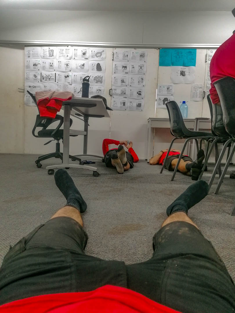 Blogiausiu atveju, turime 5 dienas užbaigti viskam. Pagal skaičius, Europoje galėtume šitą etapą užbaigti per ~3 dienas. Bet Europoje retai dirbame ~1,5+ km aukštyje, svilinant tiesiai virš galvos kabančiai saulei. Kurie jau tą buvo patyrę, patikino, kad viską ką žinome apie savo našumą, reikėtų padalinti pusiau. Grafikuose darosi labai ankšta.