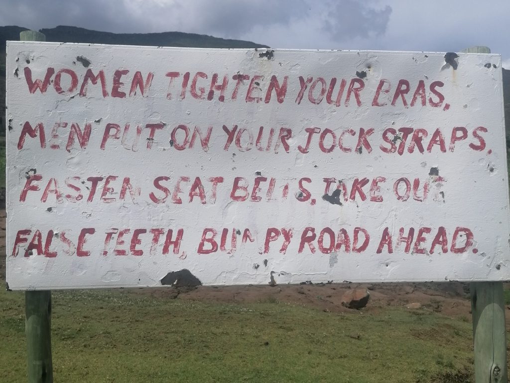 Andrea suorganizuoja visiems savaitgalį praleisti Malealea slėnyje esančioje stovyklavietėje. Išvažiavus iš sostinės ir kelias valandas pavažiavus užmiesčio keliais kuriuos supa nederlingos pievos su styrančiomis uolomis, nusukame nuo asfalto, pasijuokiame iš ženklo įspėjančio kas mūsų laukia, ir judam gilyn į kalnus.