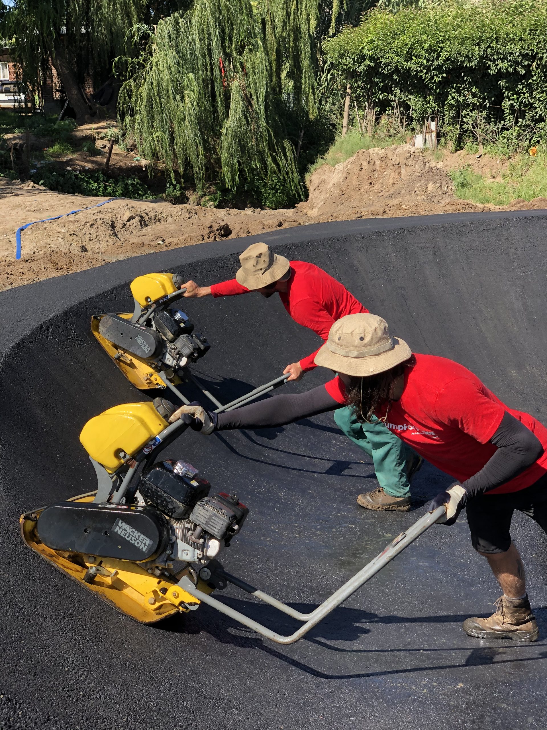 Tris kartus su visais patvirtiname planą: asfalto gamykla gamina tik vienos rūšies asfaltą, tas palengvina mūsų darbą. Sutariame, kad asfaltą pristatinės savivarčiais, po ~10 tonų, nuo pat ryto, kas kelias valandas. Vietinių pagalbininkų komanda taip pat informuota. Įrankiai paruošti. Technika paruošta. Planuojame, komunikuojame, bet visi jau žinome, kad tikrai viskas nebus taip kaip mes norim. Bus kažkaip. Kaip bus – pamatysim.